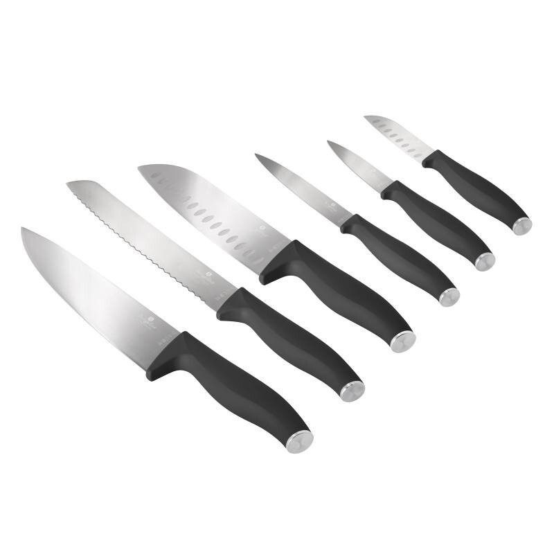 Materiál: Materiál: nerezová ocel 3cr13Kuchařský nůž 20 cmNůž na chléb 20 cmNůž Santoku 17,5 cmUžitkový nůž 12,5 cmNůž na okrajování 9 cmNůž Santoku 9 cmMagnetická dárková krabičkaBarva: antracitvysoce kvalitní nerezová ocelTepelně zpracovaná čepelErgonomická rukojeť měkká na dotekOchrana...