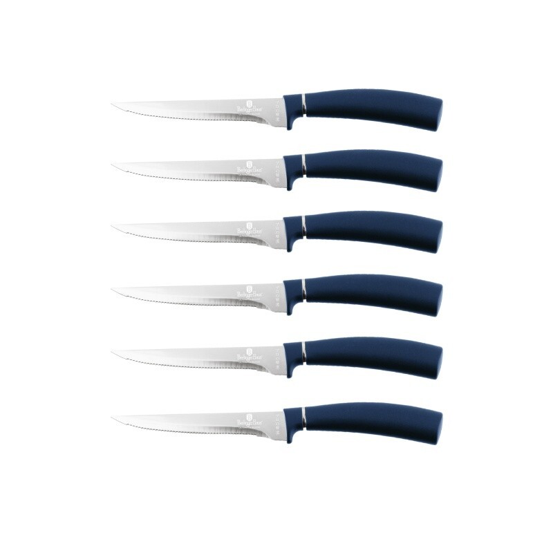 Materiál: nerezová ocel6 ks steakových nožů 11,5 cmbarva: modrá aquamarineErgonomicky navržená odolná, nová rukojeť z měkčeného plastuTitanové čepeleLaserem ostřené čepeleStylové prečítať celé