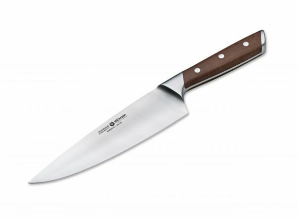 Šéfkuchársky nôž Böker Manufaktur Forge Wood Chefmesser je univerzálny nôž do každej kuchyne a hodí sa na krájanie mäsa, zeleniny, ovocia aj cibule, Má širokú čepeľ s hladkou hranou z nehrdzavejúcej chróm-molybdén-vanádovej ocele X50CrMoV15, prechádza celým nožom (full-tang). Má rukoväť z javorového dreva a nehrdzavejúcej ocele.