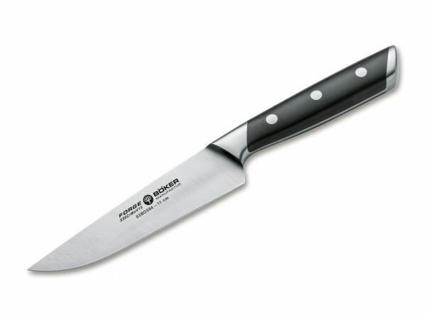 Úžitkový nôž Böker Manufaktur Forge Universalmesser je kombináciou kuchárskeho a krájacieho noža, je vhodný na krájanie ovocia, zeleniny, mäsa i rýb. Má čepeľ s hladkou hranou hranou z nehrdzavejúcej chróm-molybdén-vanádovej ocele X50CrMoV15, prechádza celým nožom (full-tang). Má rukoväť z čierneho syntetického plastu ABS.