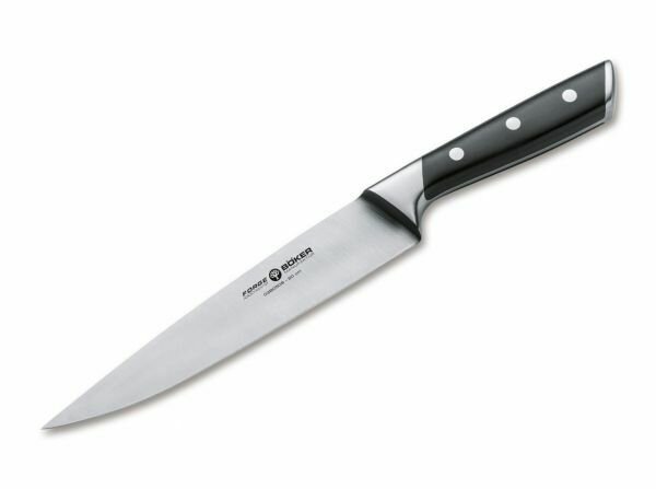 Šunkový nôž Böker Manufaktur Forge Schinkenmesser je vhodný na krájanie šunky či mäsa na tenké plátky, na ovocie a zeleninu. Má čepeľ s hladkou hranou hranou z nehrdzavejúcej chróm-molybdén-vanádovej ocele X50CrMoV15, prechádza celým nožom (full-tang). Má rukoväť z čierneho syntetického plastu ABS.