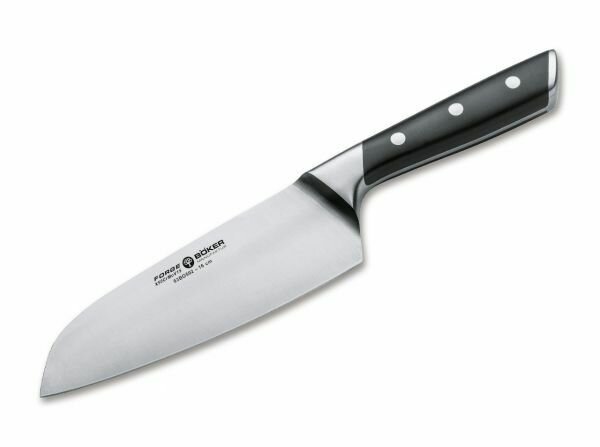 Japonský nôž Böker Manufaktur Forge Santoku znamená "Tri cnosti" t.j. hodí sa na mäso, ryby i zeleninu. Má širokú čepeľ s hladkou hranou z nehrdzavejúcej chróm-molybdén-vanádovej ocele X50CrMoV15, prechádza celým nožom (full-tang). Má rukoväť z čierneho syntetického plastu ABS.