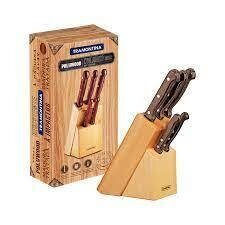 6-dielny set kuchynských nožov v drevenom stojane Tramontina 21199/983 Polywood v hnedom prevedení, majú čepele z nehrdzavejúcej ocele a rukoväte z dreva Polywood so špeciálnou úpravou odolnou voči nárazom a teplu.
