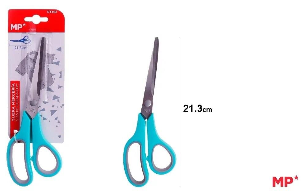 Nożyczki z termoplastyczną rękojeścią i miękką gumą dla lepszego chwytu. Ostrza ze stali nierdzewnej. Zaokrąglone końcówki zapobiegające przebiciom. Jedno z ostrzy jest szlifowane dłutem dla zapewnienia dokładności. Idealny do cięcia tkanin. Długość: 21 cm.Różne kolory: niebieski i turkusowyMix...