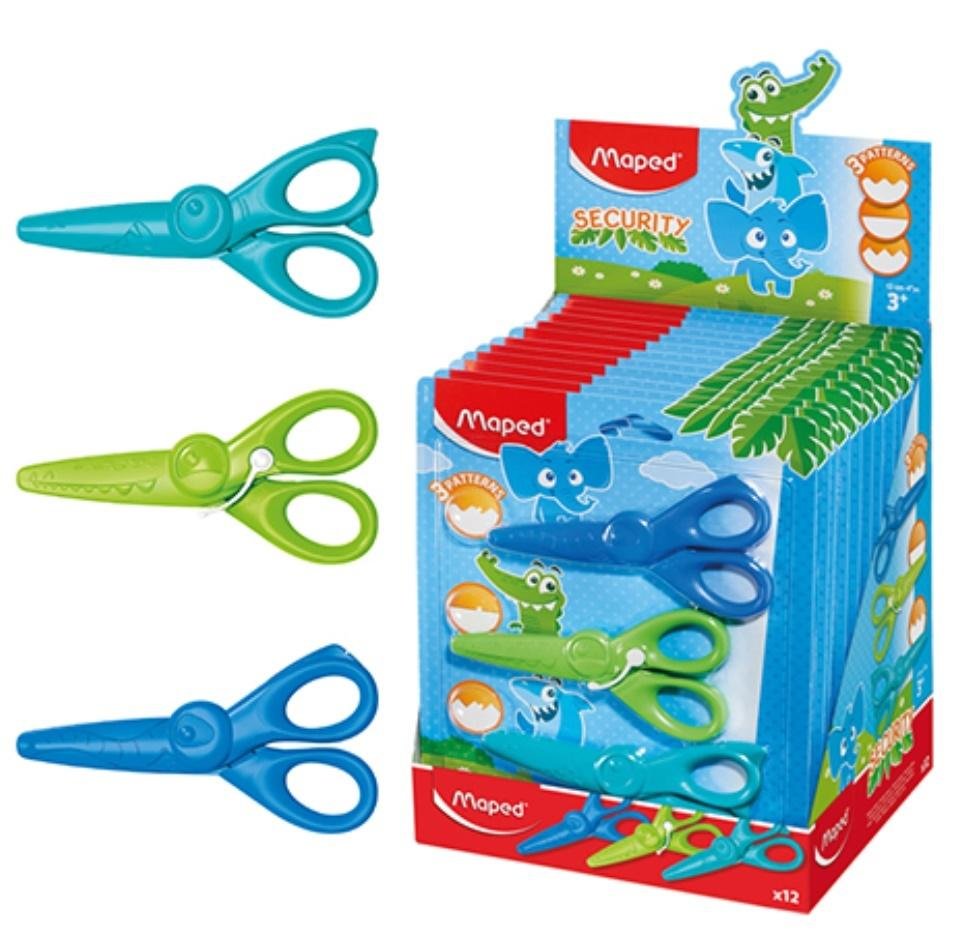 Plastikowe nożyczki kreatywne KIDICRAFT dla młodszych dzieci. Trzy rodzaje ostrzy: proste, fale i zygzaki. Trzy kolory i motywy na obudowie nożyczek: słonik, krokodyl i rekin. Bezpieczne, nie tną skóry, włosów ani ubrań, nie przewodzą prądu. Najbardziej lubiany przez dzieci wzór zygzak wbudowany w obudowę z klipem, który redukuje wysiłek niezbędny do cięcia. Blister 3 sztuki.