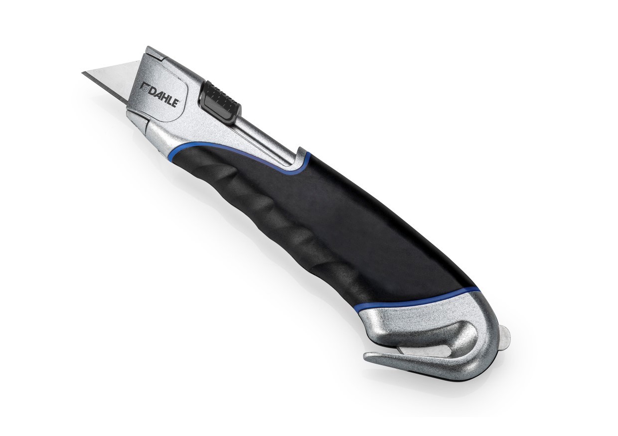 Profesionální řezací nůž s nastavitelnou výměnnou trapézovou čepelí. Celokovové pouzdro z hliníkového tlakového odlitku. Ergonomicky tvarovaná rukojeť z kovu se žebrovanou strukturou pro bezpečný úchop. Snadno vyměnitelné dělené čepele z uhlíkové oceli SK5. Mechanismus automatického zatahování čepele - po řezu se čepel automaticky zasune zpět do krytu pro zabránění možnému poranění. Balení obsahuje vsazenou čepel na blistru.