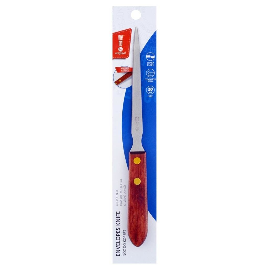 Nóż do kopert MemoBe. Stal nierdzewna z drewnianym uchwytem. Eleganckie trwałe mocowanie uchwytu. Długość całkowita to 20cm, w tym ostrze o długości 11,5cm. Każdy nóż znajduje się na blistrze ze specjalną osłonką, która zapobiega przypadkowym otarciom wewnątrz zbiorczego pudełka.