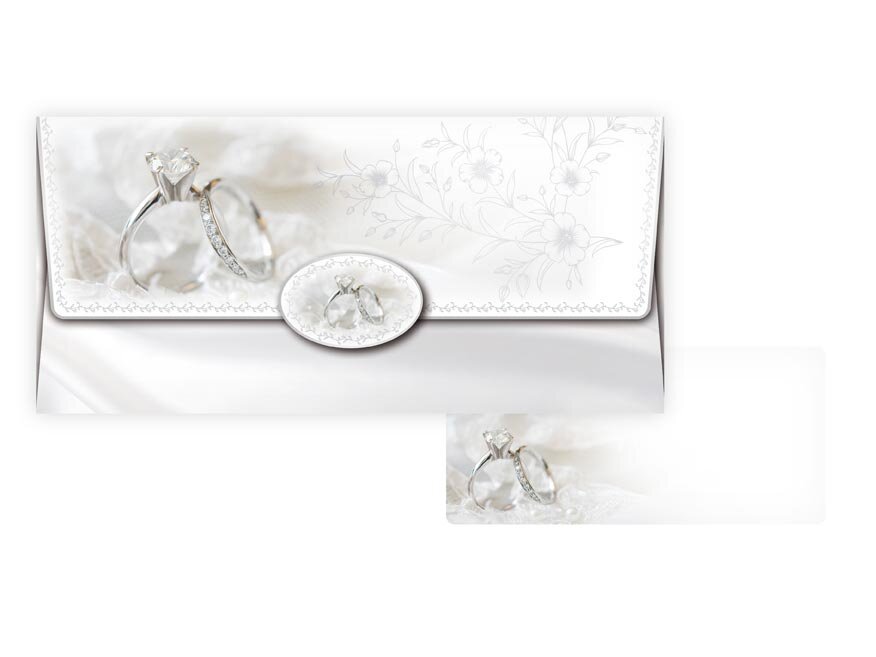 Obálka na peníze – svatební prstýnky a květinová kresbaDecentní svatební obálka na peníze v jemně bílých tónech se svatebními prstýnky a květinovou kresbou je krásným doplňkem svatebního daru. Působí čistě a slavnostně, takže dokonale podtrhne atmosféru výjimečného dne.Uvnitř je prostor pro...