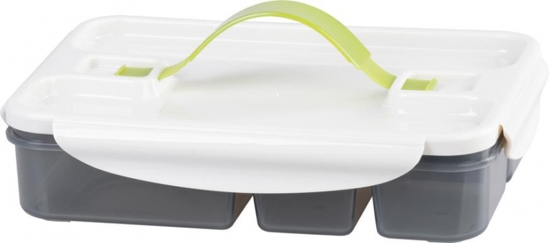 Plastový box na přenos potravin je vybavený přihrádkami na rozdělení potravin. Vhodný na turistiku, do školy na svačinu, do práce, na výlety apod. Rozměry 23.5 x 17 x 5.5. cm, objem 1000 ml. EAN 8584163072491 prečítať celé