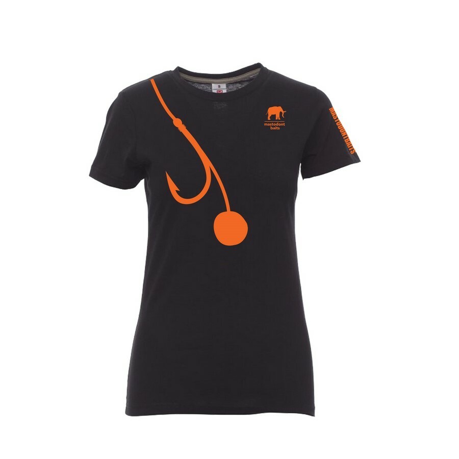Dámské tričko pro rybáře v černé barvě s krátkým rukávem a kulatým výstřihem, 1,5 cm pružný žebrovaný lem ze směsi spandex u krku s vrchním prošíváním na přední straně, barevně kontrastní výztuž od ramene k rameni viditelná na límečku, pružné švy, tubulární střih.