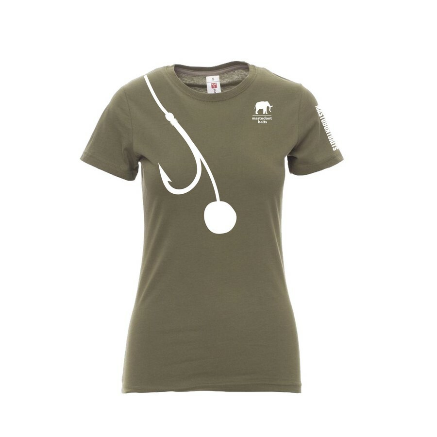 Dámské tričko pro rybáře v olivové barvě s krátkým rukávem a kulatým výstřihem, 1,5 cm pružný žebrovaný lem ze směsi spandex u krku s vrchním prošíváním na přední straně, barevně kontrastní výztuž od ramene k rameni viditelná na límečku, pružné švy, tubulární střih.