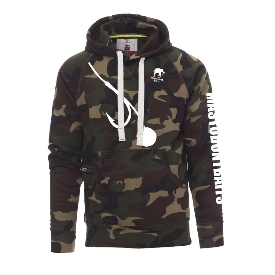 Pánská mikina maskáčové barvy pro rybáře v designu mastodont baits. Mikina s kapucí s dvojitým prošitím, bílá stahovací šňůrka se sladěným prošitím a s kovovými kroužky, raglánové rukávy, V-prošívání pod krkem, klokaní kapsa, kapsička na zip, manžety a pas s elastickým žebrováním, zesílené švy.