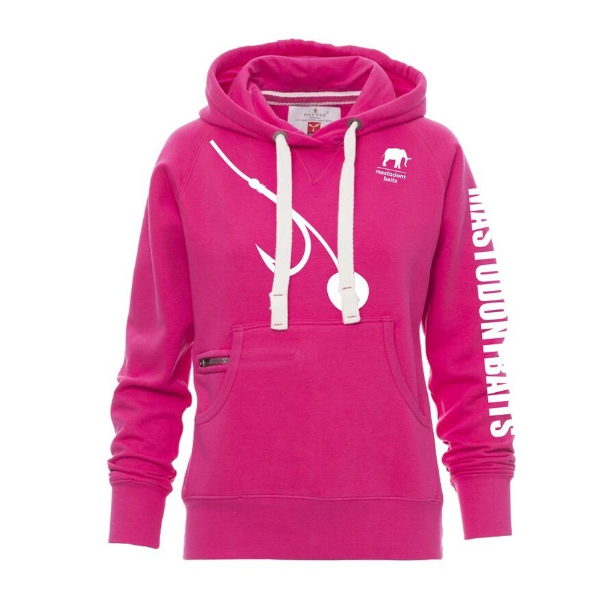 Dámská mikina fuchsiové barvy pro rybáře v designu mastodont baits. Mikina s kapucí s dvojitým prošitím, bílá stahovací šňůrka se sladěným prošitím a s kovovými kroužky, raglánové rukávy, V-prošívání pod krkem, klokaní kapsa, kapsička na zip, manžety a pas s elastickým žebrováním, zesílené švy....