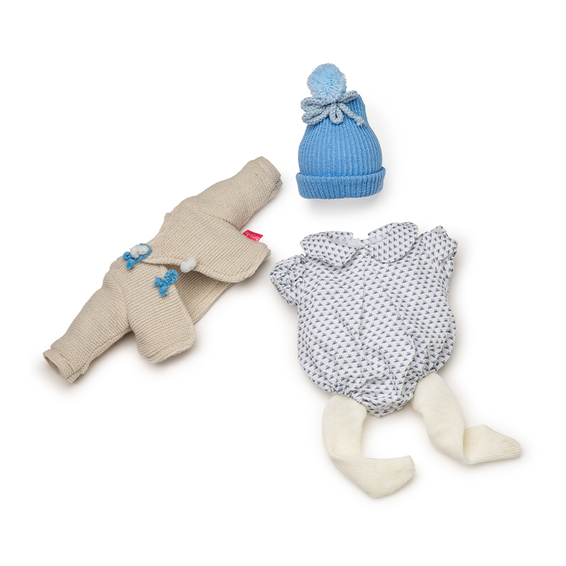 Luxusní šatičky pro panenky Baby Susú De Luxe Azul. Součástí balení je halenka s punčocháčky, čepička a svetřík. Vhodné také pro další panenky velikosti okolo 38 cm. prečítať celé