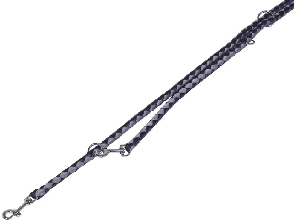 Kulaté přepínací vodítko Nobby pro psy z pleteného nylonu. S kovovou karabinou (2x) pro rychlé připnutí k obojku nebo postroji. Pomocí karabiny a kovového kroužku lze vodítko nastavit na 3 různé délky. Vhodné pro plemena malých a středních psů. Snadná údržba - při znečištění jednoduše opláchnete vodou Velikost S-M Délka vodítka: 200 cm Tloušťka vodítka: 12 mm Barva černá s šedou.
