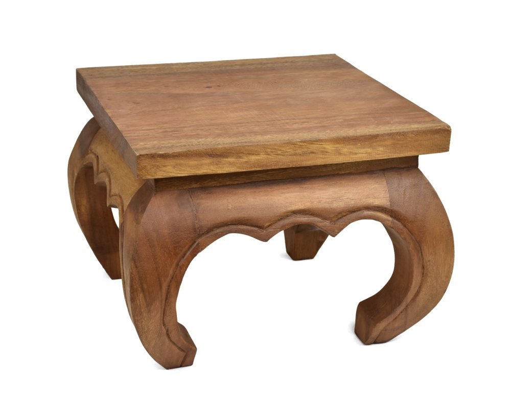 Opiové stolečky jsou charakteristické svými zahnutými nohami. Své jméno získaly díky opiovým doupatům, ve kterých byly hojně využívány. Jsou ovšem užitečné i mimo tato místa. Stoleček těchto rozměrů může například posloužit jako odkládací místo vedle křesla nebo jako noční stolek u postele. Díky ruční výrobě vyniknou všechny přirozené vizuální kvality dřeva suar a každý vyrobený kus je unikátní. Rozměry: