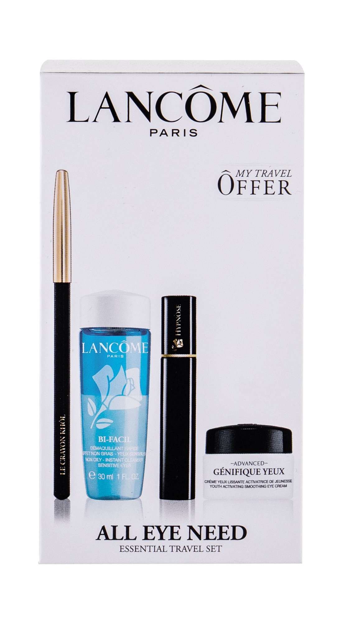 Kompletní sada pro krásné a mladistvě vypadající oči Lancôme All Eye Need Travel Set.Objemová řasenka Lancôme Hypnôse 2 ml, odstín 01 Noir HypnoticDíky řasence Lancôme Hypnôse získáte doslova hypnotický pohled, neboť až 8x zvětší jejich objem. Jemná krémová textura obhohacená vitamínem B5 jemně...
