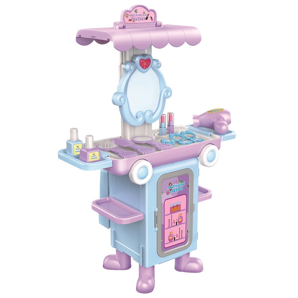 Dětský toaletní stoleček v praktickém kufříku ve tvaru autobusu je ta nejlepší hračka pro každou holčičku, která touží být krásnou princeznou. Sada obsahuje láhve s "parfémy", hřeben a kartáč na vlasy, rtěnky, prstýnky, ruční zrcátko a gumičku do vlasů. Určeno pro děti od 3 let. Baterie 3xAAA...