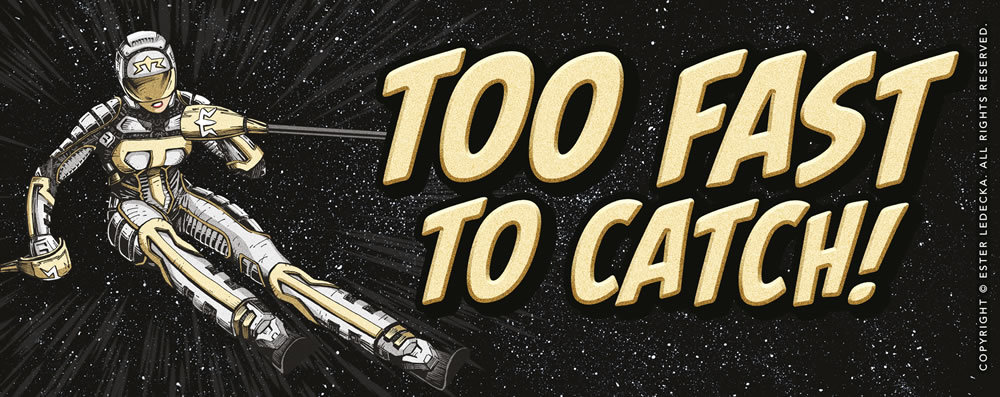 Samolepka na auto Too fast to catch vtipně upozorní na velké sportovce ve voze. prečítať celé