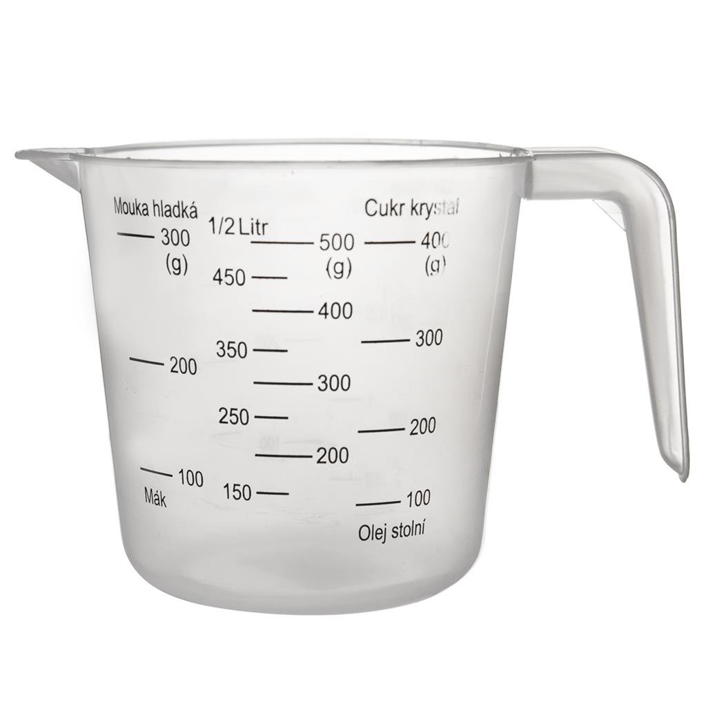 Odměrka s uchem a výlevkou. Odměrky na tekutiny, cukr, mouku, olej, mák, rýži. Materiál: plast. Transparentní. Rozměry: objem - odměrka do 500 ml, pr. 10 cm, v. 10 cm. prečítať celé