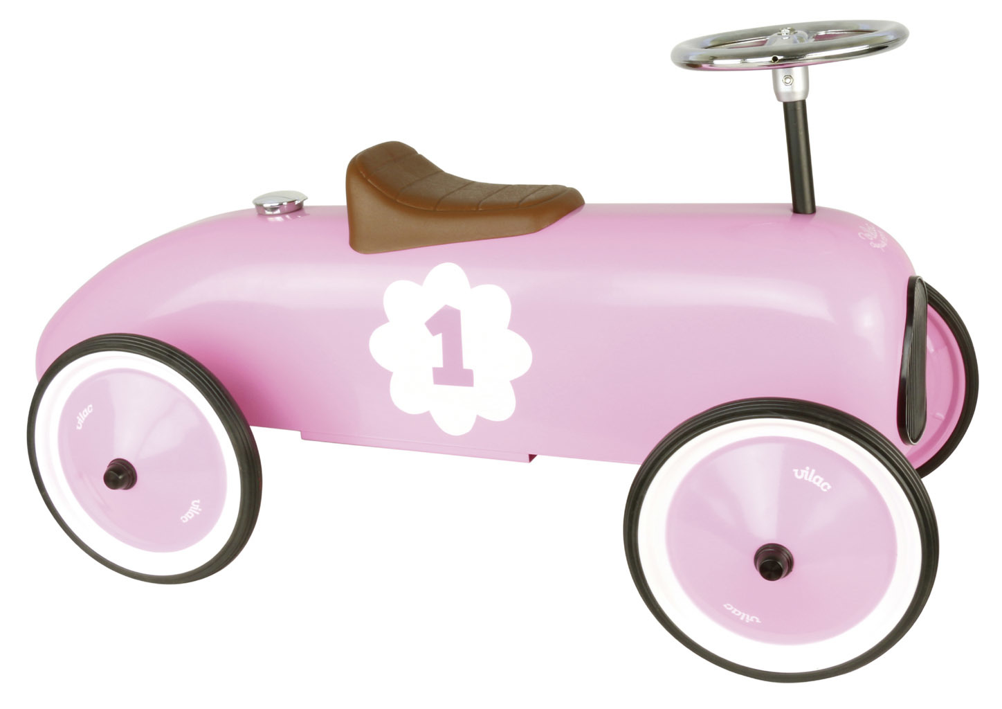 Vintage napodobenina závodního auta je plně kovová a má růžovou metalickou barvu. Volant ovládá zatáčení předních kol. Hnědé sedadlo je vyrobeno z plastu. Kola odrážedla jsou pogumovaná a zaručují tak tichý chod i na pevném povrchu. Hračky Vilac mají značku francouzské agentury ADEME, to znamená,...