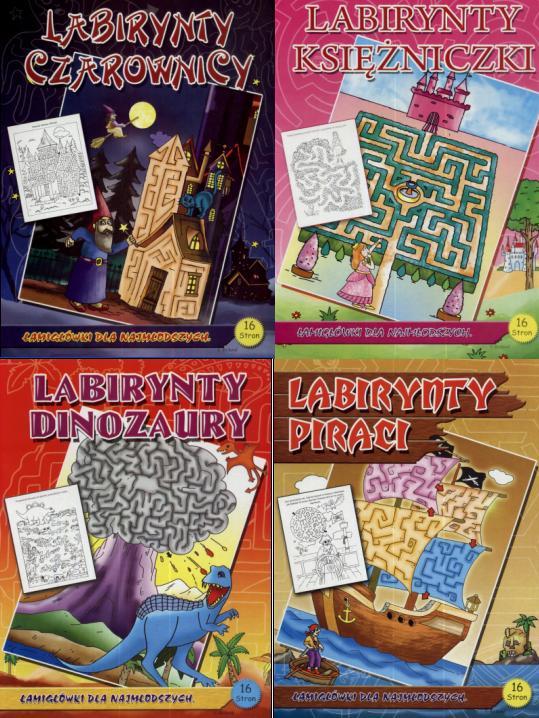 Te tematyczne labirynty wspaniale rozwijają wyobraźnię dziecka. Dziecko pokonuje różne przeszkody, odnajduje drogę, szuka skarbów razem z piratami, dinozaurami, księżniczkami lub wiedźmami. Kolekcjonuj wszystkie 4 rodzje labiryntów, a także inne łamigłówki oraz malowanki.Labirynty czarownicyLabirynty księżniczkiLabirynty dinozauryLabirynty piraci