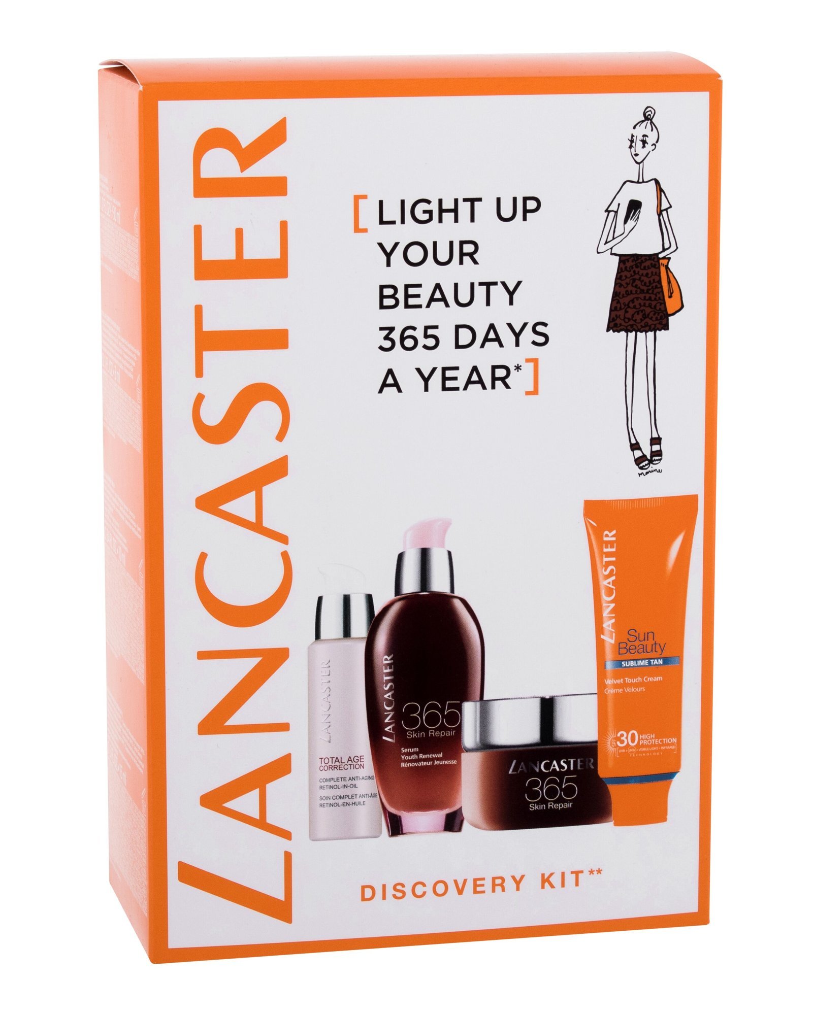 Lancaster 365 Discovery Kit denní pleťový krém 365 Skin Repair SPF15 15 ml + pleťové sérum 365 Skin Repair 10 ml + pleťové sérum Total Age Correction Retinol-In-Oil 3 ml + čisticí pleťové mléko Express Cleanser 30 ml + krém na opalování Sun Beauty Velvet