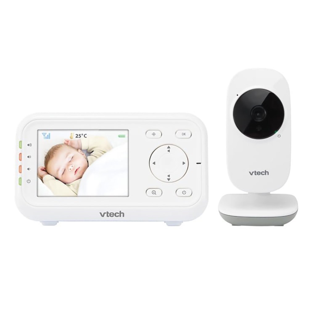 Dětská video chůvička Vtech VM3255 s velkým 2,8“ LCD displejem. Chůvička je praktickým pomocníkem v péči o miminko.Vyznačuje se vynikajícím přenosem obrazu i zvuku díky digitální technologii FHSS 2,4 GHz, včetně automatického infračerveného nočního vidění a zoomování. . Zařízení podobné vysílačce...