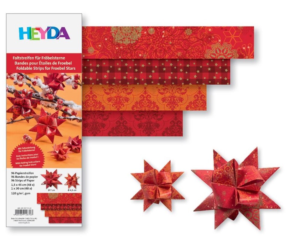 Sada skládacích proužků na výrobu až 24 hvězd o průměru 4,5 cm a průměru 7cm, obsahuje i návod na složení. Balení: 96 proužků se čtyřmi motivy, potištěné oboustranně 120g/m2. Ve 2 velikostech 1cm x 30cm, 1,5cm x 45cm. prečítať celé