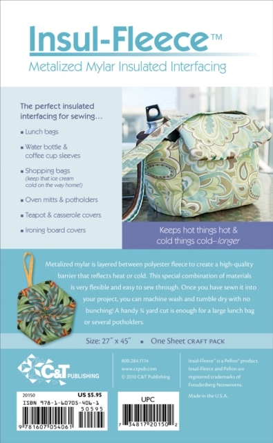 Metalized mylar is layered between polyester fleece to create a high-quality barrier that reflects* heat or cold. This special combination of materials is very flexible and easy to sew through. Once it is sewn into a project, it can be machine washed and tumble dried with no bunching! A handy pack of a - yard cut is enough for a large lunch bag or several potholders.