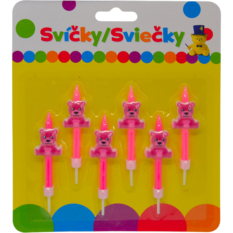 Narozeninová svíčka s růžovým MEDVÍDKEM a držákem 6ks