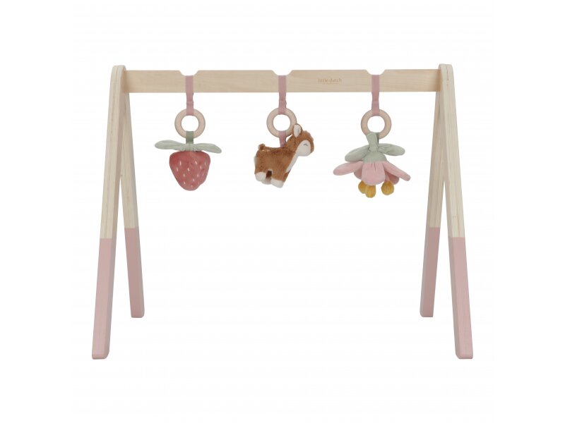 Táto štýlová hracia tyč je vyrobená z kvalitného a odolného dreva a disponuje tromi jemnými plyšovými hračkami, ktoré sú zavesené v podobe srnky, jahôdky a kvietku. Každá z nich láka dieťa k preskúmavaniu, dotýkaniu sa a vďaka svojim vlastnostiam pri pohybe chrastí a šuští, čo stimuluje zmysly vašich najmenších a prináša im hodiny zábavy na deke.