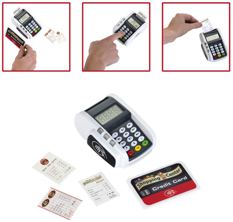 Platební terminál se zvukovými a světelnými efekty. Obsahuje 3 poukazy a 1 kreditní kartu s bezkontaktní funkcí. Baterie nejsou součástí balení. Vhodné od 3 let. prečítať celé