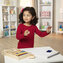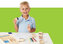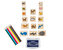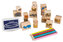 Obsahuje: 16 dřevěných razítek, modrý inkoustový polštářek plněný netoxickým omyvatelným inkoustem a sedm barevných pastelek.