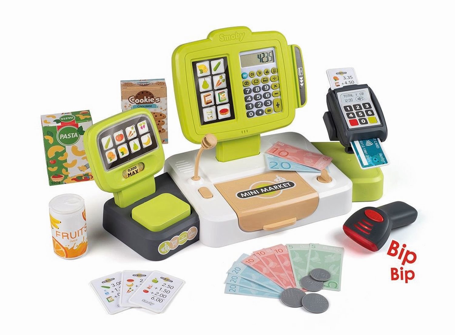 Táto elektronická pokladňa v zelenošedej farbe kombinuje funkčnosť s hravosťou. Umožňuje deťom nielen skúmať svet obchodu, ale aj naučiť sa základy počítania a manipulácie s peniazmi. Vďaka zabudovanej skutočnej kalkulačke a skeneru s osvetlením a zvukovou funkciou budú hry úplne realistické a zábavné. Výhodou je tiež čítačka kreditných kariet s doprovodnou účtenkou, ktorá rozširuje možnosti hry. Mechanická váha s maketami potravín navyše umožňuje nielen váženie, ale aj rozvoj motoriky a zmyslu pre presnosť. Mikrofón pridáva možnosť zapojiť vlastný hlas a spraviť hru ešte interaktívnejšou.