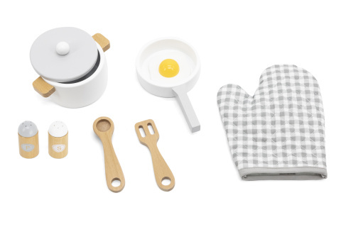 Tato kuchyňská sada obsahuje pánev s poklicí, pánev s vajíčkem, 2 nádobky na koření, stěrku, lžíci a látkovou chňapku. Skvělá kuchyňská hrací sada pro děti podporuje představivost a koordinaci rukou s očima. Rozměry balení 19,5x14x7 cm. Rozměry pánve s pokličkou 12,5x9,3x8,2, rozměry pánvičky...