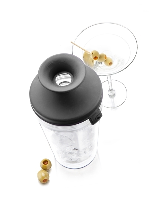 Praktický sklenený šejker Vacu Vin s odmerkou a integrovaným sitkom. Vrchná časť umožňujúca vzduchotesné uzatvorenie je vyrobená z tvrdeného silikónu.