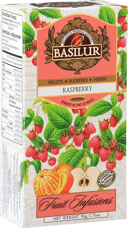 Ovocný čaj aromatizovaný, porcovanýSložení: ibišek květ 70 %, pomerančová kůra 10 %, jablko plod 8,9 %, lístky stévie 4 %, přírodní aroma (malina, kyselina citrónová) Hmotnost: 50g (25x2g) Návod na přípravu: 1 sáček / lžičku na 250ml šálek, zalít vodou 100°C, louhovat 3-5 minutVýrobce: Basilur...