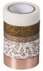 Páska lepicí papírová se používá ke kreativním účelům. Můžete s ní ozdobit různé výrobky při tvoření - kětináče, vázy, svícny, stojánky. Dozdobení různých deníků, zápisníků, památníků... Na přední straně krabičky jsou zoubky k odtržení lepenky. Motiv: efekt bronzová / bílá