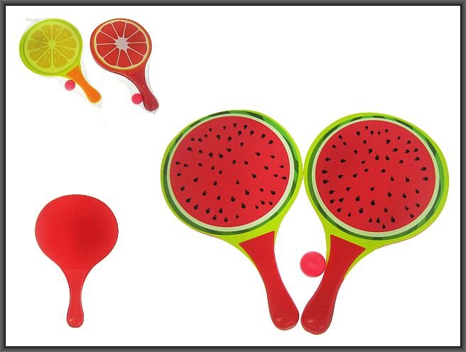 Rakietki wykonane są z drewna i ozdobione kolorowymi motywami owocowymi, co czyni je atrakcyjnymi dla dzieci. Ich rozmiar i lekka konstrukcja sprawiają, że są łatwe do trzymania i używania przez najmłodszych. Idealne do rozwijania koordynacji ruchowej i aktywności fizycznej na świeżym powietrzu.