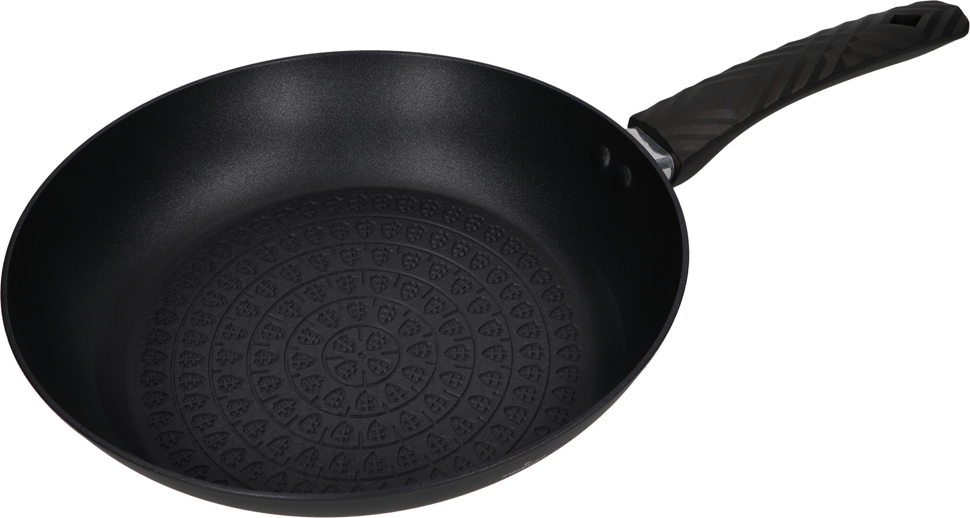 Patelnia wykonana z aluminium tłoczonego na gorąco typu forged. Wewnątrz 3-warstwowa nieprzywierająca powłoka firmy PFLUON z charakterystycznym wzorem na jej dnie, który wspomaga proces smażenia z uwagi na dokładne rozchodzenie się tłuszczu po dnie patelni. Na zewnątrz patelnię zabezpieczno...