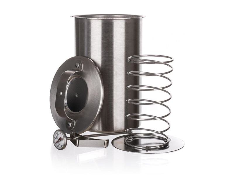 - V balení najdete hrnec, víčko, sáček, přítlačnou pružinu, teploměr a recept