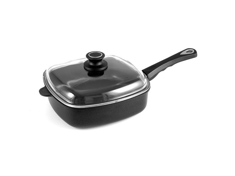 Na hranaté pánvi s pětivrstvým silným dnem a nepřilnavým povrchem LOTAN® můžete smažit, zapékat, restovat i dusit bez použití tuku. Univerzální pro všechny typy ohřevu, záruka 2 + 2 roky, vyrobeno v Německu. Jaká musí být nejlepší pánev? Univerzální, pro všechny typy přípravy pokrmů i pro všechny druhy ohřevů. Se silným dnem, které zajistí rovnoměrné rozvádění tepla. Se spolehlivou rukojetí a nepřilnavým povrchem. Prohlédněte si čtvercovou, 8 cm vysokou pánev, která splňuje všechny uvedené požadavky na dokonalou pánev. Je univerzální pro všechny typy ohřevů, teplo vede dokonale rovnoměrně, jídlo se na ní díky speciální nepřilnavé vrstvě LOTAN® nepřipaluje a smažit či zapékat můžete bez použití oleje. Pánev G21 Pool s poklicí je odolná teplotám až do 240 °C, takže ji můžete bez obav vložit i do trouby. Pánve vyrábíme v Německu pomocí ručního lití a na vysoké kvalitě je to znát. Dno pánve G21 Pool o tloušťce 9 mm je složeno z 5 vrstev. Sendvičové provedení bez vzduchových kapes a špičkové vlastnosti jednotlivých vrstev tvoří dohromady dokonalý celek. Základní vrstva je z hliníku, následuje vrstva z oxidu titaničitého, ochranná vrstva proti korozi, keramická vrstva a nepřilnavost vnitřní strany pánve G21 Pool zajišťuje vrstva LOTAN®, nanášená speciální plasmovou polymerací. Tato technologie zvyšuje odolnost povrchu a zabraňuje připalování pokrmů. Speciální provedení pánve G21 Pool zabraňuje připalování nebo přilnutí surovin a pokrmů ke dnu či stěnám pánve. Pánev po použití můžete mýt v myčce, ale snazší a rychlejší je opláchnutí teplou vodou s troškou mycího přípravku. Ušetříte tak čas při vkládání do myčky a čekání na konec mycího cyklu, pánev je téměř okamžitě připravena k dalšímu použití. Skleněná poklice pánve G21 Pool je z tvrzeného a odolného skla s úchytem pro snadné držení bez obav z popálení. Víko pánve má pod rukojetí důmyslně řešený otvor pro odvod horké páry. Velkou předností pánve Pool s víkem je jejich odolnost – jak pánev, tak víko, můžete vložit do trouby a péct či zapékat nebo dusit pokrmy až do teploty 240 °C.