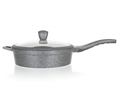Hliníková hluboká pánev MARRONE o průměru 28 cm je opatřena vnitřním nepřilnavým povrchem, který zabraňuje připalování jídel při vaření. Pánev je vybavena skleněnou poklicí s knobem se silikonovým povrchem, který zajišťuje ochranu proti popálení při vaření. Ergonomická rukojeť se soft-touch povrchovou úpravou zaručuje snadnou manipulaci. Dno pánve je ošetřeno žáruvzdorným granitovým nástřikem. Pánev je dodávána v šedé barvě s granitovým dekorem.