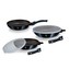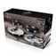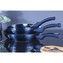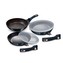 Multifunkční sada pánví Aquamarine Metallic obsahuje celkem 3 pánve a 2 kulatá skladovací víčka. Velká a střední pánvička mají navíc odnímatelnou rukojeť, takže je můžete bez obav vložit do trouby pro zapékání až do 220°C. Zároveň to šetří místo při skladování.