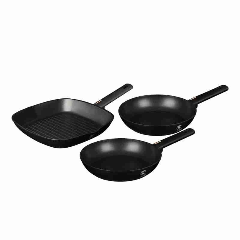 Sada 3 ks pánví, kolekce Monaco• Materiál: kovaný hliník s černým titanovým nepřilnavým povrchem• Zahrnout:• Pánev O204,5 cm 1,0L• Pánev O244,8 cm 1,7L• Grilovací pánev O28*4,1 cm 2,1L• Barva: matná černá• Silnostěnný materiál těla z kovaného hliníku• Ergonomická rukojeť Soft-touch• Plná indukce•...
