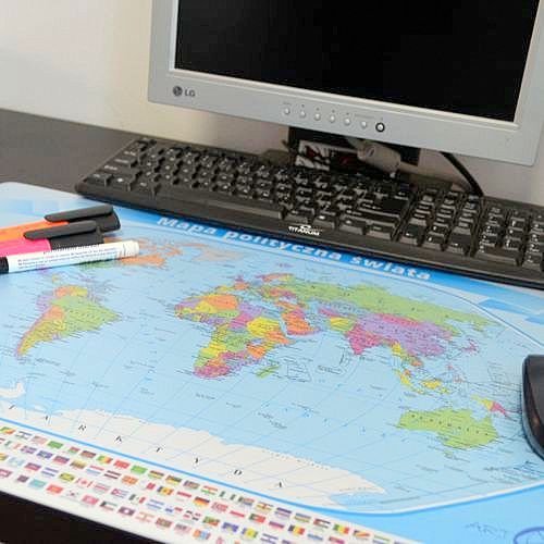 Podkładka z mapą polityczną, może pełnić rolę zarówno edukacyjną, jak i zabawową. Na obrazku zaznaczono barwnie kontynenty, naniesiono nazwy państw i stolic. Dzięki temu mapa jest fascynującym źródłem wiedzy o naszej planecie. Przekazuje w ciekawy sposób informacje z zakresu geografii. Pobudza wyobraźnię, zachęca do zdobywania wiedzy i inspiruje. Jakość i estetyka wykonania sprawiają, że stanowi idealny pomysł na prezent.
