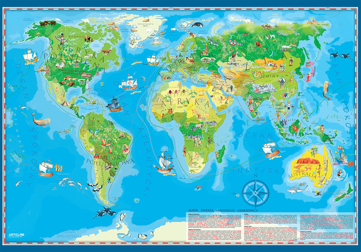 Geograficzna podkładka z mapą świata dla dzieci, pełniąca rolę edukacyjną oraz dekoracyjną. Zaznaczono na niej barwnie kontynenty wraz z ukształtowaniem terenu, jak też za pomocą kolorowych piktogramów najbardziej znane budowle świata, zwierzęta, pomniki przyrody, wydarzenia. Dzięki temu mapa...