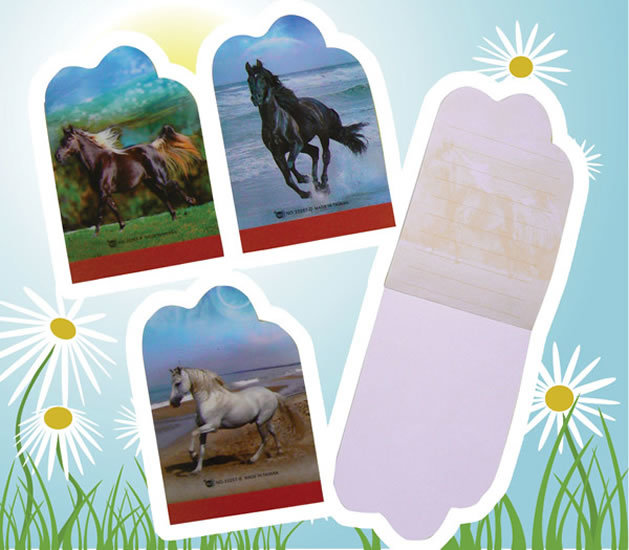 Malý zápisník na nejrůznější poznámky. Například na adresy a telefovy, na úkoly, atd. Tři různé motivy s vyobrazením koní. Velikost: 65 x 95 mm. Obálka bločku je pevná plastová. Vevnitř jsou stránky nalinkované a jemně podtištěné obrázkem koně. prečítať celé