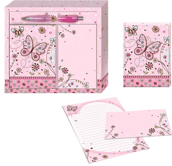 Dárková sada pro psaní dopisů – motýl. Obsahuje diář se zámkem, obálku, psací papíry a propisku. prečítať celé